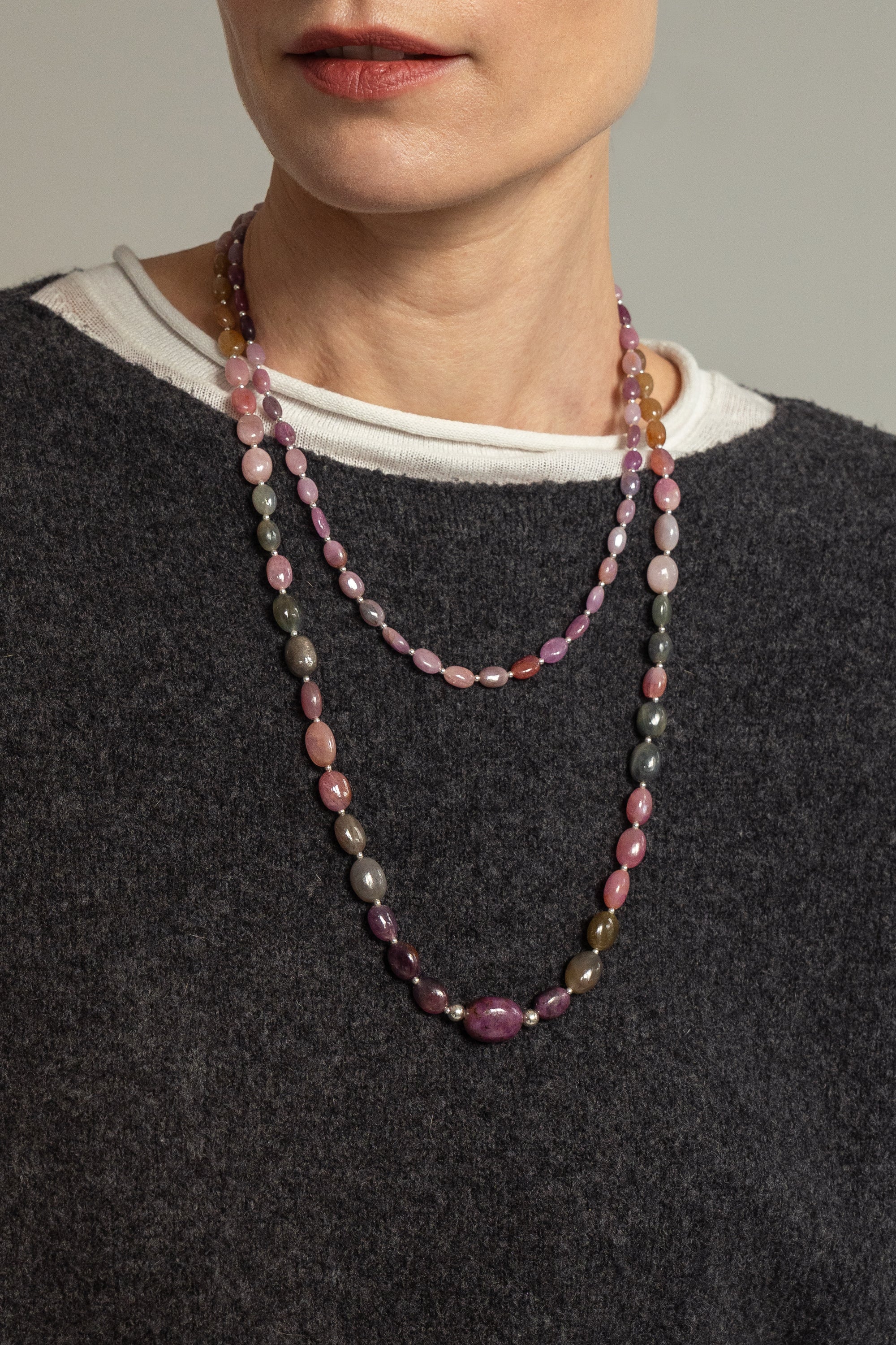Fantasia du Saphir Violet (kratší náhrdelník na fotografii) vznikla ručně v Du Coeur, s úctou k příběhu každého kamene.