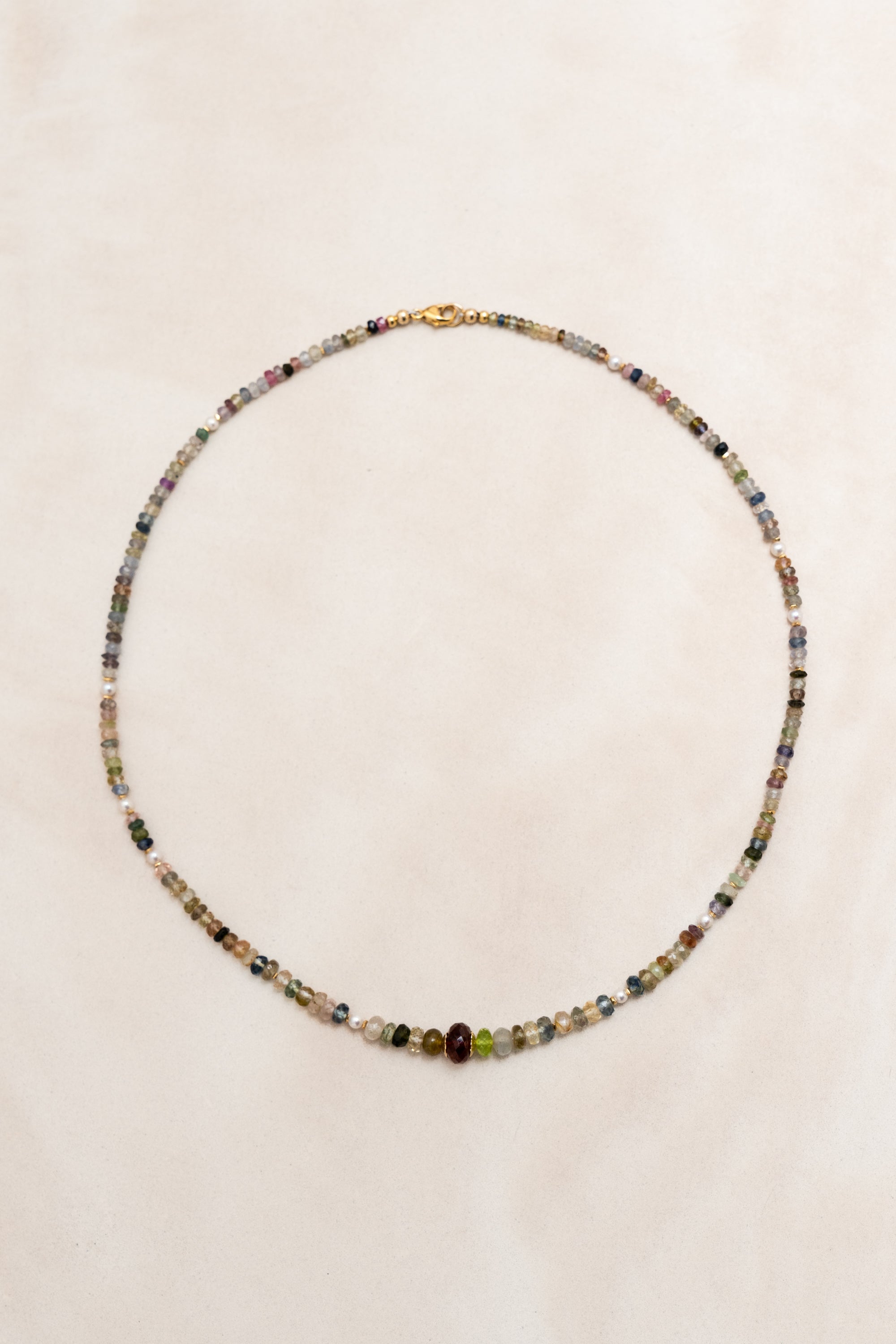 Náhrdelník Verveine zdobí pečlivě vybrané různobarevné safíry – vzácné kameny klidu, moudrosti a duchovní čistoty. Malým detailem šperku je jemná říční perla, symbol čistoty a ženské elegance.