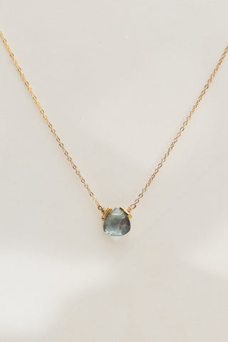 A delicate, shorter necklace with a drop-shaped aquamarine.