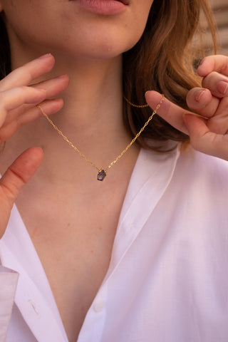 Náhrdelník Ariel je spojením elegance a přírodní krásy. Jeho obdelníkové jemné očka tvoří sofistikovaný řetízek, uprostřed kterého září fialovomodrý kámen Iolit. Kameny mají unikátní geometrický brus. Každý je jedinečný, žádné dva náhrdelníky Ariel nejsou stejné. Fialovomodrá barva kamene evokuje vlny oceánu a přináší do vašeho života klid a vnitřní mír.